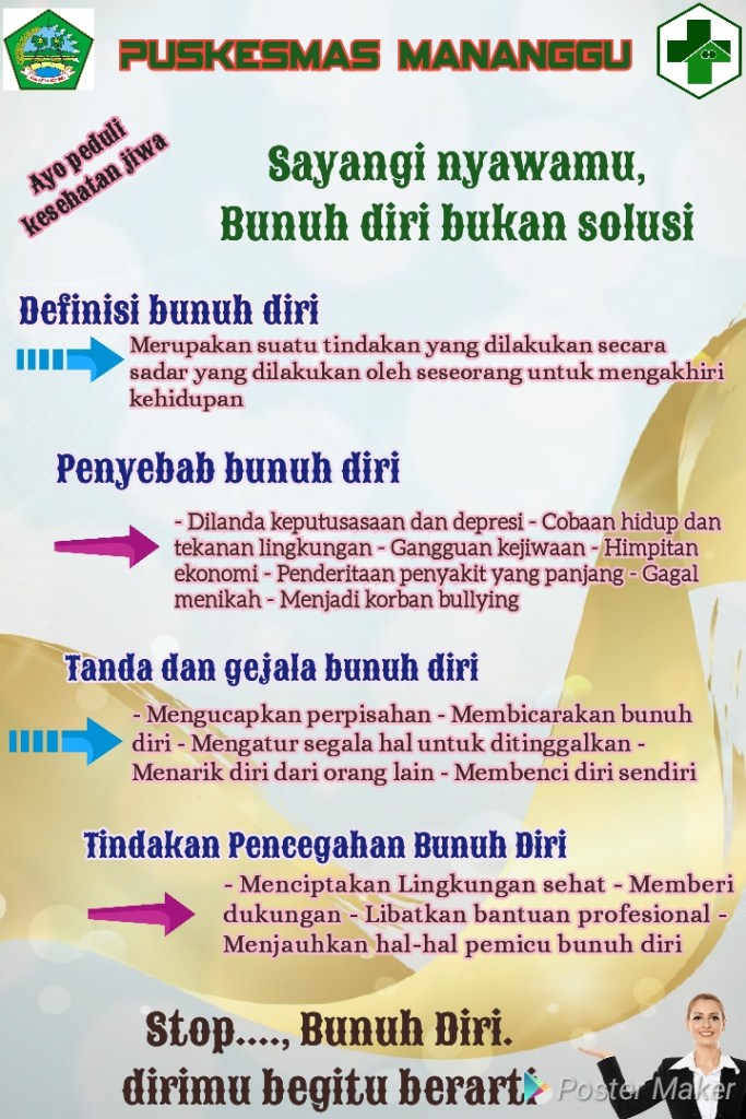 Assalamualaikum..Terkait dengan meningkatnya kasus bunuh diri yang ada di provinsi Gorontalo, kami selaku petugas kesehatan jiwa puskesmas mananggu mengimbau kepada seluruh masyarakat kecamatan mananggu, apabila ada keluarga, teman, atau tetangga yang di curigai mengalami gangguan kecemasan yg berlebih atau gangguan depresi, agar kiranya segera melakukan skrining kesehatan jiwa di puskesmas mananggu atau di tempat tempat pelayanan kesehatan seperti posyandu dan posbindu.. insya allah kami dari petugas kesehatan jiwa siap memberikan konseling tentang kesehatan mental kepada masyarakat yang membutuhakan agar tidak terjadi hal hal yg tidak di kita inginkan . Semoga kita semua di jauhkan dari perbuatan perbuatan yg merugikan diri kita sendiri.Sayangi nyawa anda BUNUH DIRI BUKAN SOLUSISalam sehat jiwa🙏🙏🙏#keswapkmmananggu #promkespkmmanaggu#kesehatanjiwa #salamsehatjiwa