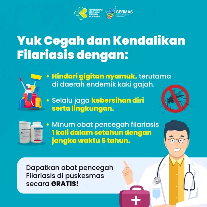 Karena semua jenis nyamuk bisa menjadi pembawa penyakit ini, jangan biarkan penyakit ini berkembang. Kita jaga kebersihan lingkungan dan minum obat pencegah kaki gajah khususnya yang berada di daerah endemis.